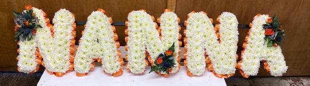 The base flowers are white, the colour or ribbon around the edge of the letter can be in any colour and the small spray of flowers on some of the letters can be done in any colour.